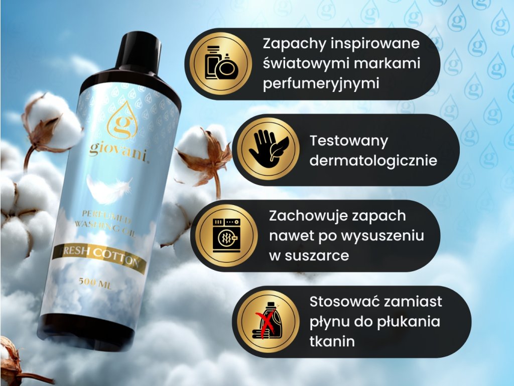 Esencje zapachowe olejku do prania Giovani® Fresh Cotton oddają jego specyficzny charakter. Słodko-świeża konwalia wprowadzi do Twojego domu aromat wiosny. Fiołek nada praniu czysty i świeży aromat. Elegancki jaśmin w połączeniu z różą oczarują Cię luksusem i wyrafinowaniem. Serce zapachu wzbogacone jest ciepłym bobem tonka i słodkim marcepanem. Kremowa wanilia, piżmo i egzotyczne labdanum dopełniają bazę.