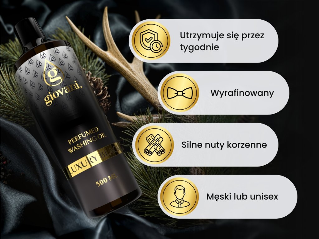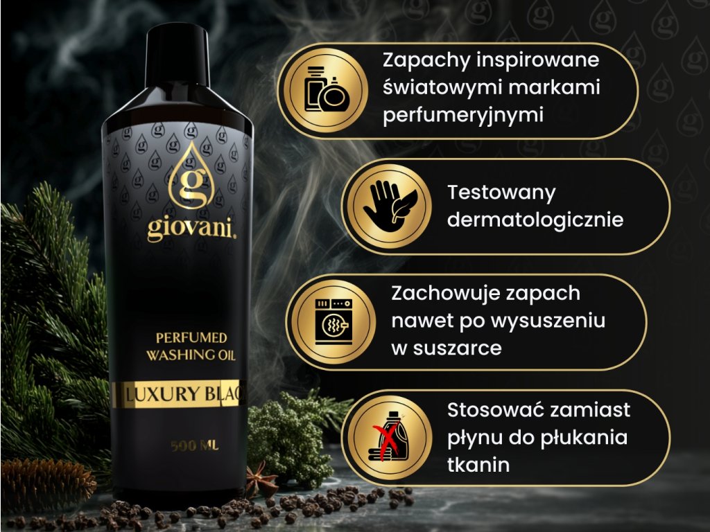 Połączenie korzennych i kwiatowych olejków zapachowych tworzy wyjątkowe doznania węchowe w postaci zapachu perfum do prania GIOVANI® Luxury Black.