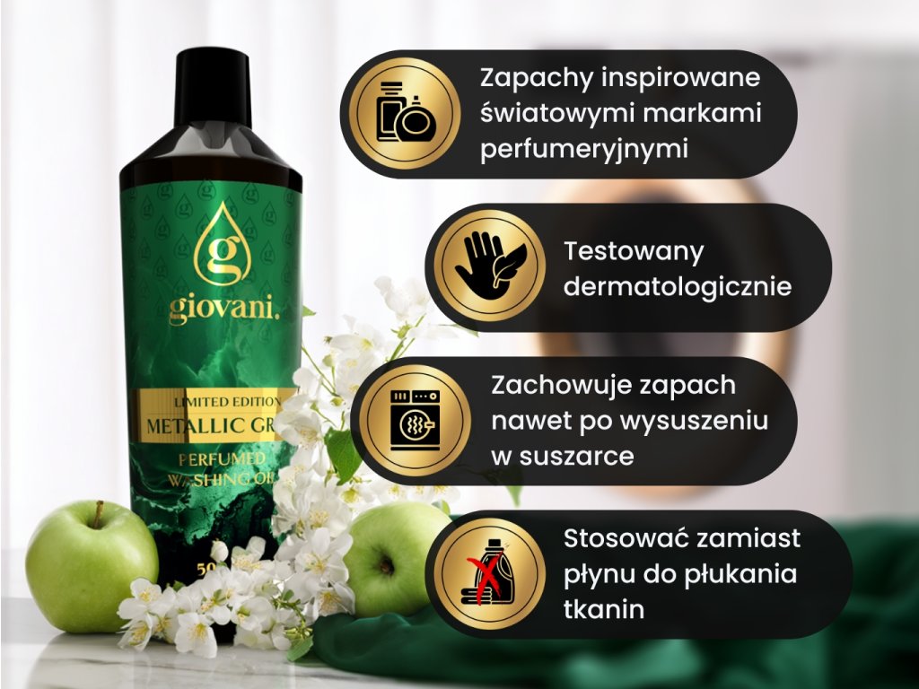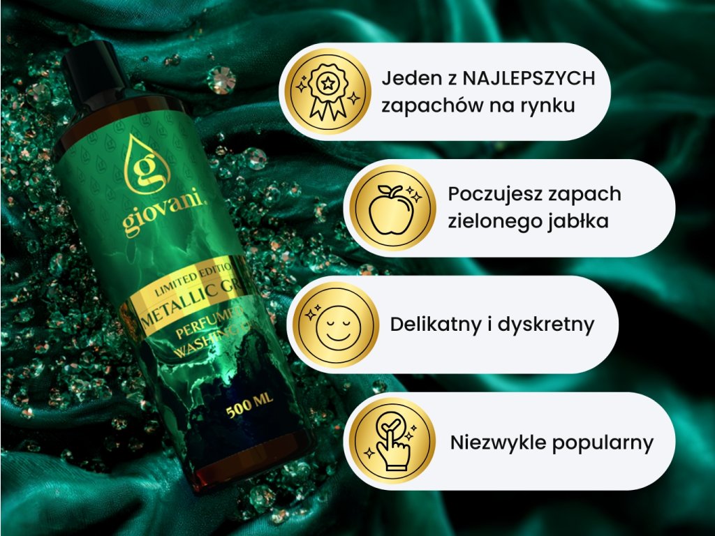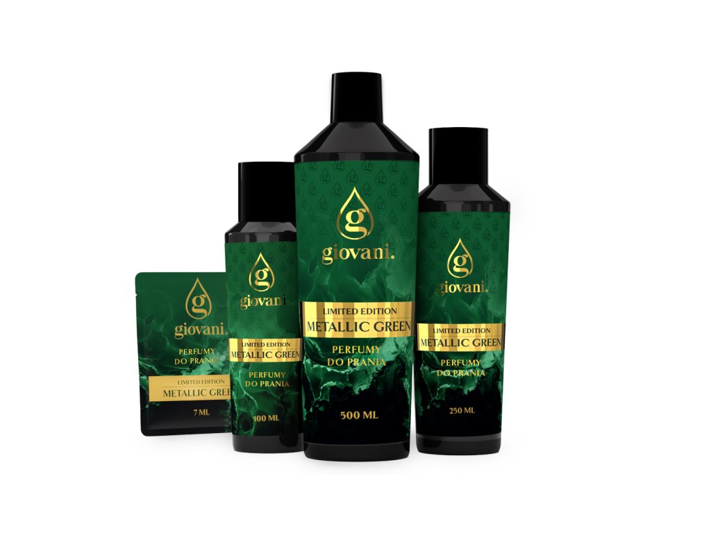 Limitowana edycja Metallic Green marki Giovani® została stworzona z myślą o wyjątkowości i jak najintensywniejszych doznaniach zapachowych. Po praniu Twoje pranie i dom przez długi czas będą pachnieć słodko-świeżym aromatem perfum.
