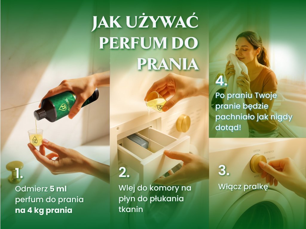 Sposób użycia: wlej 5 ml koncentratu do pojemnika na płyn do płukania tkanin. Ta ilość będzie idealna na 4 kg prania. Koncentrat nie jest rozcieńczany. Do dozowania możesz użyć nakrętki perfumu Giovani®, która odpowiada 3 ml – zalecamy aplikację 2 dawek. Dla wygodnego dozowania możesz zakupić miarkę z naszym logo lub pompkę dozującą. Wystarczy niewielka ilość , a Twoje pranie będzie idealnie pachnące!