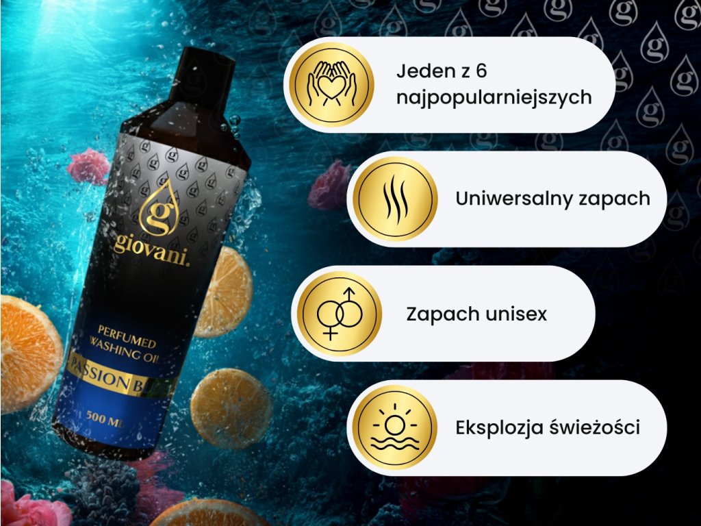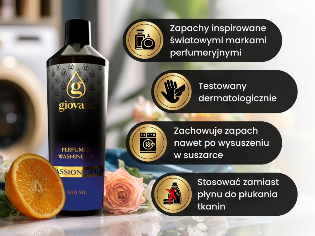 Giovani® to ekskluzywna i luksusowa marka perfum do prania. Dołożyliśmy wszelkich starań, aby zapewnić ich wysoką jakość. Podczas opracowywania tych zapachów ważne było dla nas osiągnięcie ich silnej intensywności i długotrwałej trwałości, abyśmy mogli mówić o Giovani® jako o najwyższej jakości marce perfum do prania na rynku. Ich wielką zaletą jest to, że nie zatykają pralki, nie pozostawiają tłustego osadu i nie brudzą ubrań. Dzięki zawartości niektórych substancji, nasze olejki dbają również o kolor prania. Są wegańskie, wolne od dioksanów, SVHC, parabenów, tenzydów, substancji PBT/vPvB, metali ciężkich, pozostałości zanieczyszczeń, mikroplastików czy nanoplastików. Wyjątkowości marce Giovani® dodaje jej luksusowy design. |
