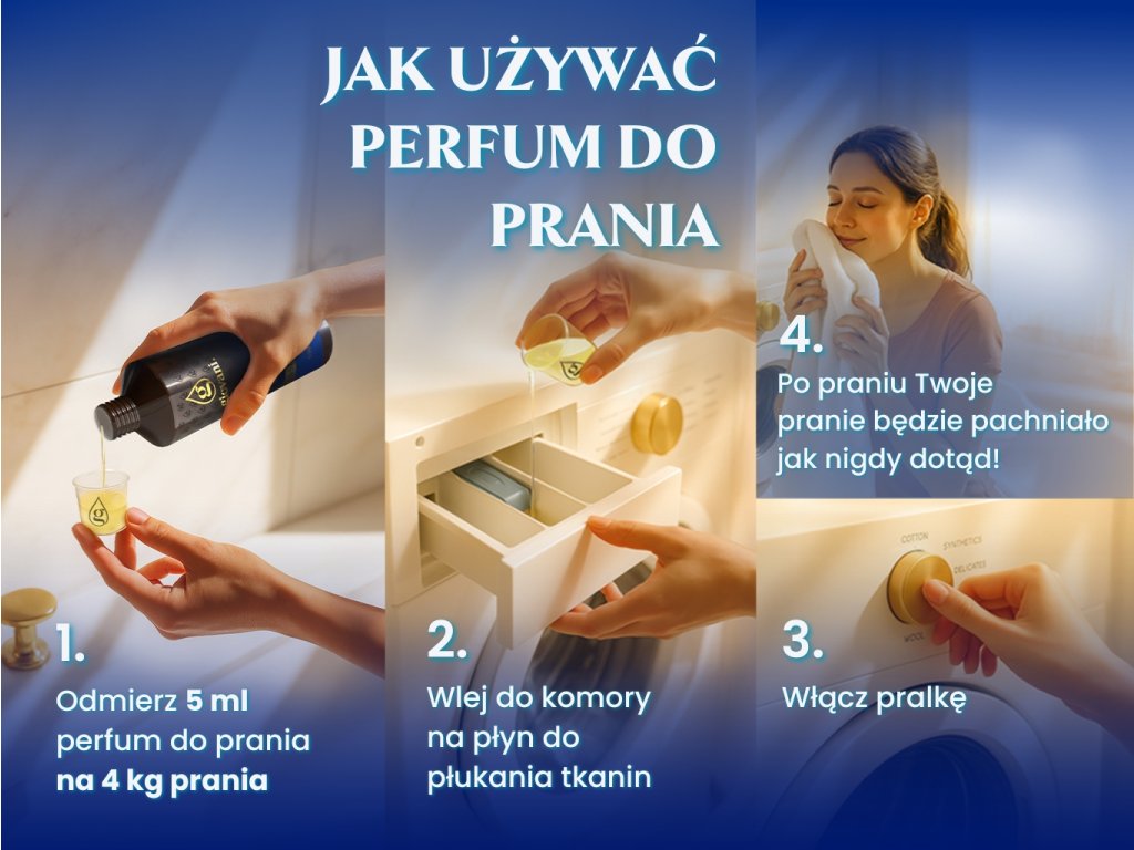 Sposób użycia: wlej 5 ml koncentratu do pojemnika na płyn do płukania tkanin. Ta ilość będzie idealna na 4 kg prania. Koncentrat nie jest rozcieńczany. Do dozowania możesz użyć nakrętki perfumu Giovani®, która odpowiada 3 ml – zalecamy aplikację 2 dawek. Dla wygodnego dozowania możesz zakupić miarkę z naszym logo lub pompkę dozującą. Wystarczy niewielka ilość , a Twoje pranie będzie idealnie pachnące!
