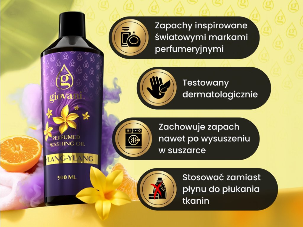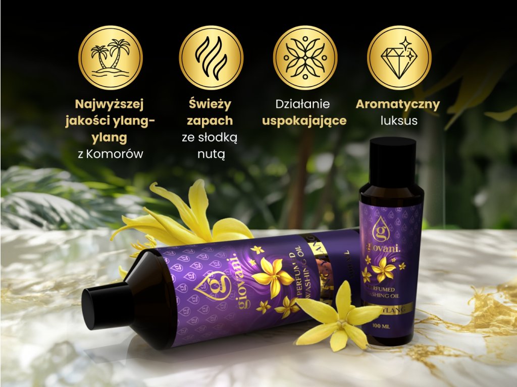 Główna esencja perfum do prania Giovani® YLANG-YLANG pochodzi z Wysp Komorów, znanych z najdoskonalszego ylang-ylangu na świecie. W aromaterapii wykorzystywana jest do łagodzenia stresu, niepokoju oraz wspierania spokojnego i regenerującego snu.