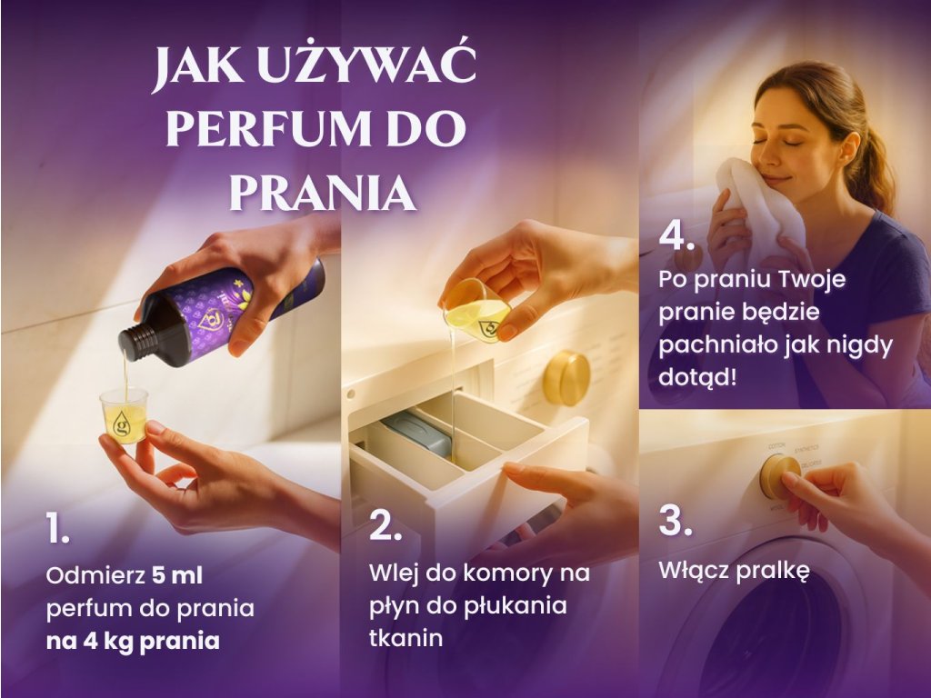 Sposób użycia: wlej 5 ml koncentratu do pojemnika na płyn do płukania tkanin. Ta ilość będzie idealna na 4 kg prania. Koncentrat nie jest rozcieńczany. Do dozowania możesz użyć nakrętki perfumu Giovani®, która odpowiada 3 ml – zalecamy aplikację 2 dawek. Dla wygodnego dozowania możesz zakupić miarkę z naszym logo lub pompkę dozującą. Wystarczy niewielka ilość , a Twoje pranie będzie idealnie pachnące!