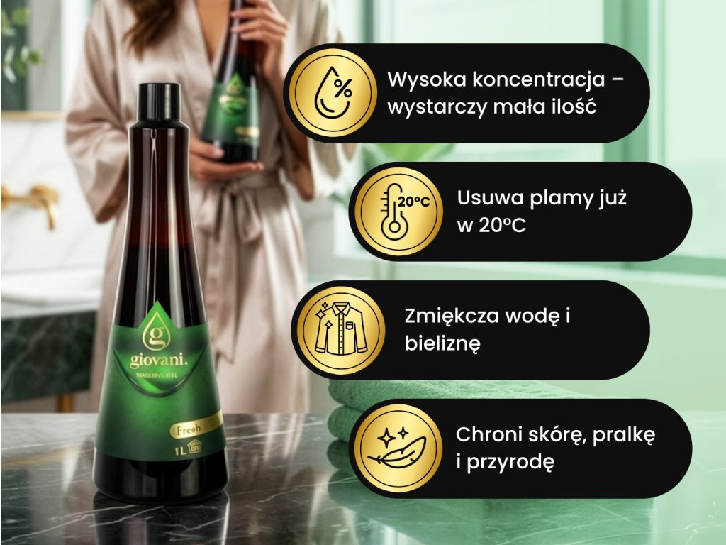 Pranie nie musi być tylko obowiązkiem. Z żelem do prania Giovani® FRESH staje się orzeźwiającym doświadczeniem. Ten wysoko skoncentrowany żel skutecznie czyści tkaniny już przy niskich dawkach i temperaturach.